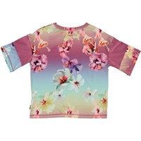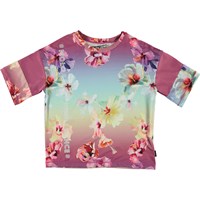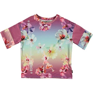 Odessa is een gebloemde roze t-shirt met een comfortabele en ruimvallende pasvorm. Het t-shirt heeft een brede, roze streep op elke mouw. Odessa maakt deel uit van Molo's sportcollectie, die helpt sport en mode te integreren. Het t-shirt is comfortabel en gefabriceerd met technische materialen wat het draagbaar maakt voor vrije tijd en intense activiteit. De sportcollectie van Molo is gemaakt met een unieke, hoogwaardige technologie genaamd HeiQ Smart Temp, die het lichaam ondersteunt om af te koelen. De afkoelfunctie wordt geactiveerd wanneer het lichaam warm en zweterig wordt en schakelt vervolgens uit wanneer het lichaam is afgekoeld. HeiQ Smart Temp zorgt voor optimaal comfort en prestaties. Het is onafhankelijk getest om te garanderen dat het veilig is voor de huid.