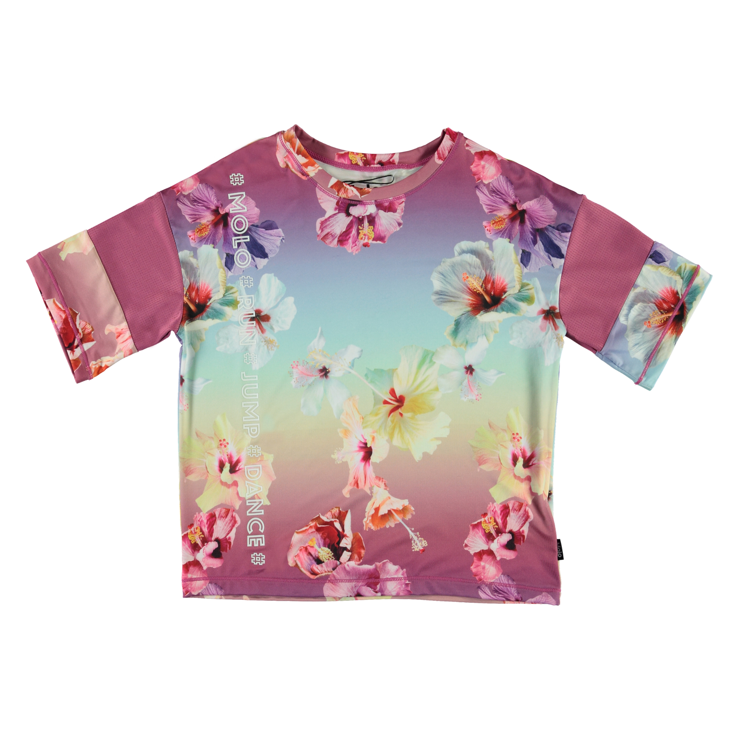 Odessa is een gebloemde roze t-shirt met een comfortabele en ruimvallende pasvorm. Het t-shirt heeft een brede, roze streep op elke mouw. Odessa maakt deel uit van Molo's sportcollectie, die helpt sport en mode te integreren. Het t-shirt is comfortabel en gefabriceerd met technische materialen wat het draagbaar maakt voor vrije tijd en intense activiteit. De sportcollectie van Molo is gemaakt met een unieke, hoogwaardige technologie genaamd HeiQ Smart Temp, die het lichaam ondersteunt om af te koelen. De afkoelfunctie wordt geactiveerd wanneer het lichaam warm en zweterig wordt en schakelt vervolgens uit wanneer het lichaam is afgekoeld. HeiQ Smart Temp zorgt voor optimaal comfort en prestaties. Het is onafhankelijk getest om te garanderen dat het veilig is voor de huid.