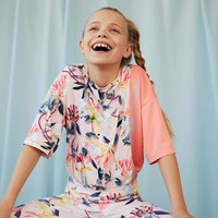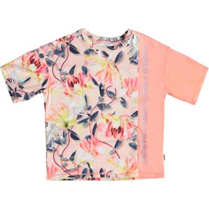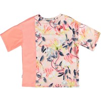 Odessa is een roze en koraalkleurig t-shirt met een bloemenprint en een koraalrood kleurig paneel met een lichtblauwe sporttekst. De top heeft een ruimvallende comfortabele pasvorm. Odessa maakt deel uit van Molo's nieuwe sportcollectie, die sport en mode integreert. De top is comfortabel en gemaakt van technische materialen die het zowel voor vrije tijd als voor intensieve activiteiten draagbaar maakt. De sportcollectie van Molo is gemaakt met een unieke hoogwaardige technologie genaamd HeiQ Smart Temp, die het lichaamseigen vermogen om af te koelen ondersteunt. De afkoelfunctie wordt geactiveerd wanneer het lichaam warm en zweterig wordt en wordt vervolgens uitgeschakeld wanneer het lichaam is afgekoeld. HeiQ Smart Temp zorgt voor optimaal comfort en prestaties. Het is onafhankelijk getest om er zeker van te zijn dat het veilig is voor de huid.