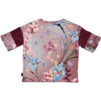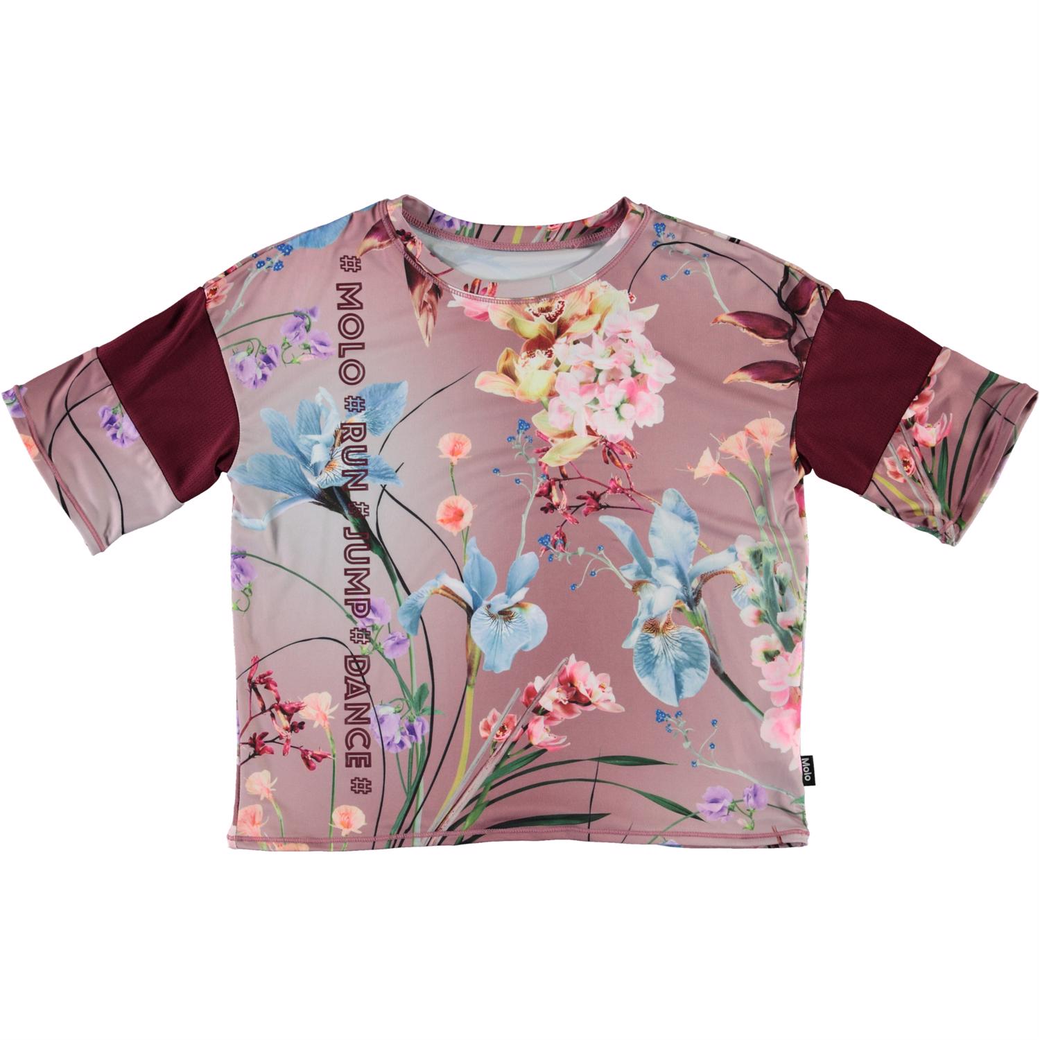 Odessa is een t-shirt met een bloemenprint in een comfortabele ruimvallende pasvorm. Het t-shirt heeft een brede paarse streep op elke mouw. Odessa maakt deel uit van Molo's sportcollectie, die helpt bij het integreren van sport en mode. De top is comfortabel en gefabriceerd met technische materialen wat het draagbaar maakt voor vrije tijd en intense activiteit. Molo's sportcollectie is gemaakt met een unieke, hoogwaardige technologie genaamd HeiQ Smart Temp, die het lichaam ondersteunt om af te koelen. De afkoelfunctie wordt geactiveerd wanneer het lichaam warm en zweterig wordt en schakelt vervolgens uit wanneer het lichaam is afgekoeld. HeiQ Smart Temp zorgt voor optimaal comfort en prestaties. Het is onafhankelijk getest om te garanderen dat het veilig is voor de huid.