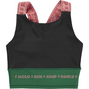 Zwarte sporttop met brede oudroze schouderbandjes met een Molo geprinte tekst, en de onderrand is groen. De top is comfortabel en gemaakt van technische materialen waardoor het zowel tijdens rust als tijdens intensieve activiteiten kan worden gedragen. De sportcollectie van Molo is gemaakt met een unieke, hoogwaardige technologie genaamd HeiQ Smart Temp, die het lichaam ondersteunt om af te koelen. De afkoelfunctie wordt geactiveerd wanneer het lichaam warm en zweterig is. Het wordt gedeactiveerd wanneer het lichaam is afgekoeld. HeiQ Smart Temp zorgt voor optimaal comfort en prestatie. Het is onafhankelijk getest om er zeker van te zijn dat het veilig is voor de huid.