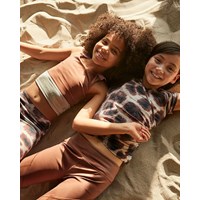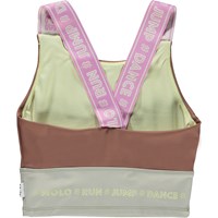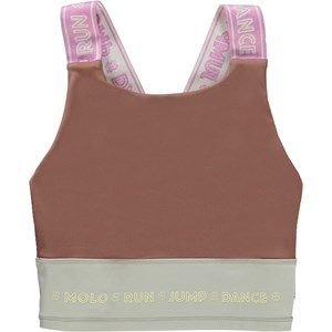 Oliva is a brown sports top with wide, pink straps with a text and a beige background. The top is perfect under Molo's sports jackets. Olivia is part of Molo's sports collection, which helps integrate sports and fashion. The top is comfortable and constructed in technical materials that make it wearable for down time as well as intense activity. Molo’s sports collection is created with a unique, high performance technology called HeiQ Smart Temp, which supports the body's own ability to cool down. The cool down function is activated when the body gets warm and sweaty. It is deactivated when the body has cooled down. HeiQ Smart Temp ensures optimal comfort and performance. It has been independently tested to ensure that it is safe for the skin.