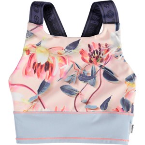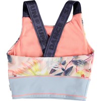 Oliva is een lichtroze sporttop met een prachtige bloemenprint. Het heeft brede blauwe schouderbandjes met tekst en de onderste boord is lichtblauw met oranje stiksels. De top is perfect onder Molo's sportjas. Olivia maakt deel uit van Molo's nieuwe sportcollectie, die sport en mode integreert. De top is comfortabel en gemaakt van technische materialen die het zowel voor vrije tijd als voor intensieve activiteiten draagbaar maakt. De sportcollectie van Molo is gemaakt met een unieke hoogwaardige technologie genaamd HeiQ Smart Temp, die het lichaamseigen vermogen om af te koelen ondersteunt. De afkoelfunctie wordt geactiveerd wanneer het lichaam warm en zweterig wordt en wordt vervolgens uitgeschakeld wanneer het lichaam is afgekoeld. HeiQ Smart Temp zorgt voor optimaal comfort en prestaties. Het is onafhankelijk getest om er zeker van te zijn dat het veilig is voor de huid.
