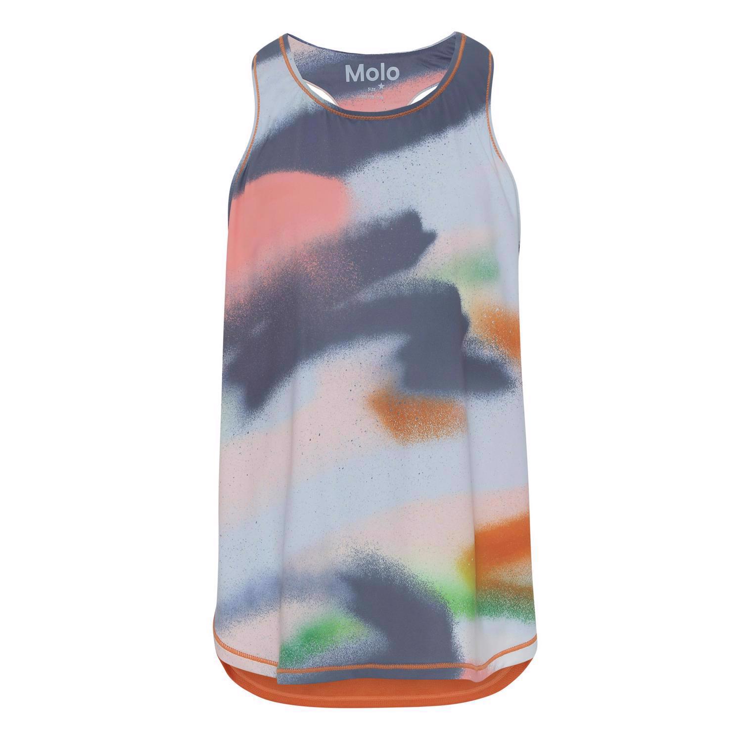 Oriana is een kleurrijke sporttop met een spuitbus print en een oranjekleurige achterkant met brede blauwe strepen met tekst. De top maakt deel uit van Molo's nieuwe sportcollectie, die sport en mode integreert. De top is comfortabel en gemaakt van technische materialen die het zowel voor vrije tijd als voor intensieve activiteiten draagbaar maakt. De sportcollectie van Molo is gemaakt met een unieke hoogwaardige technologie genaamd HeiQ Smart Temp, die het lichaamseigen vermogen om af te koelen ondersteunt. De afkoelfunctie wordt geactiveerd wanneer het lichaam warm en zweterig wordt en wordt vervolgens uitgeschakeld wanneer het lichaam is afgekoeld. HeiQ Smart Temp zorgt voor optimaal comfort en prestaties. Het is onafhankelijk getest om er zeker van te zijn dat het veilig is voor de huid.