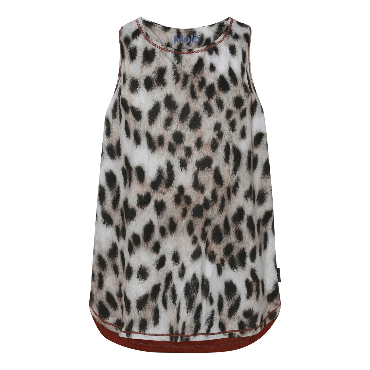 Oriana is een sporthemdje met een sneeuwluipaarden print en een bruine achterkant met brede bandjes met tekst. Het hemdje maakt deel uit van Molo's sportcollectie, die mode en sport naadloos integreert. Het is comfortabel en gemaakt van technische materialen. Molo's sportcollectie is gemaakt met een unieke, hoogwaardige technologie genaamd HeiQ Smart Temp, die het lichaam ondersteunt om af te koelen. De afkoelfunctie wordt geactiveerd wanneer het lichaam warm en zweterig is. Het wordt gedeactiveerd wanneer het lichaam is afgekoeld. HeiQ Smart Temp zorgt voor optimale prestaties en comfort. Onafhankelijk getest op huidveiligheid.