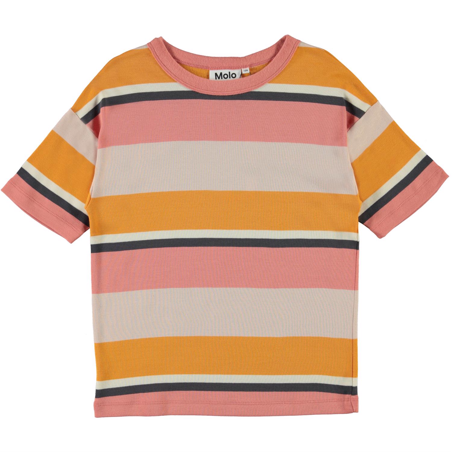 Rabecke is een gestreept t-shirt in geel, lichtroze en beige. Het t-shirt is ruimvallend en heeft afhangende schouders.