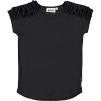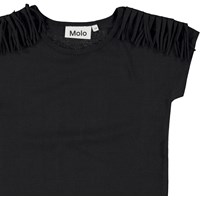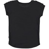 Radmilla is een zwart t-shirt met korte mouwen en franjes op de schouders.