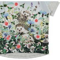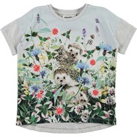 Raeesa is een lichtblauwe t-shirt met een print van egels in een zee van wilde bloemen en klaver. Het t-shirt valt ruim en heeft lichtgrijze mouwen.