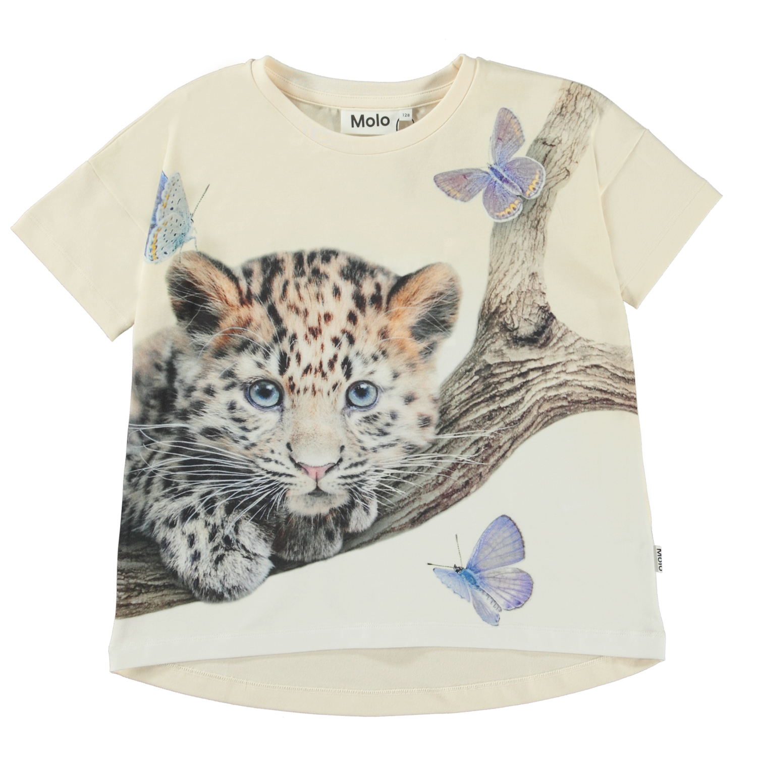 Raeesa is een lichtgele t-shirt van biologisch katoen. De achterkant is iets langer dan de voorkant en het heeft een print van een luipaard welp die op een tak ligt en kijkt naar de vlinder