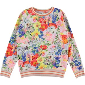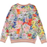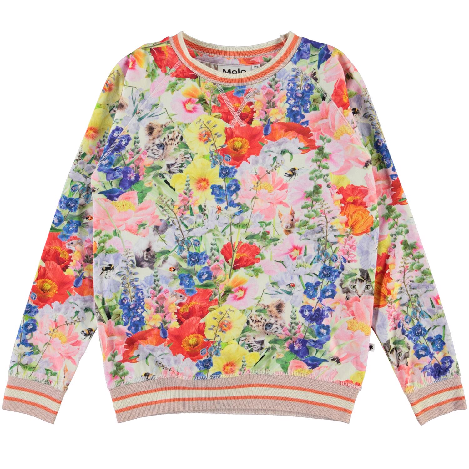 Raewyn is een sweater met de ‘Hide and Seek’ printout verschillende dieren die zich tussen de bloemen verstoppen. De sweater heeft raglanmouwen en roze gestreepte ribboorden rond de mouwen, kraag en onderkant.