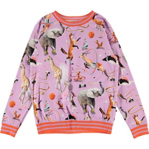 Raewyn is een paarse trui met een totale print van dieren die sporten. Rond de hals, mouwen en onderkant heeft Raewyn een gestreepte rib die overeenkomt met de kleur in de print.