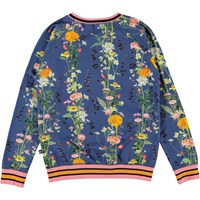 Raewyn is een blauwe sweater met een print van verticale bloemenkettingen. De sweater heeft raglanmouwen en roze gestreepte ribboorden rond de mouwen, kraag en onderkant.