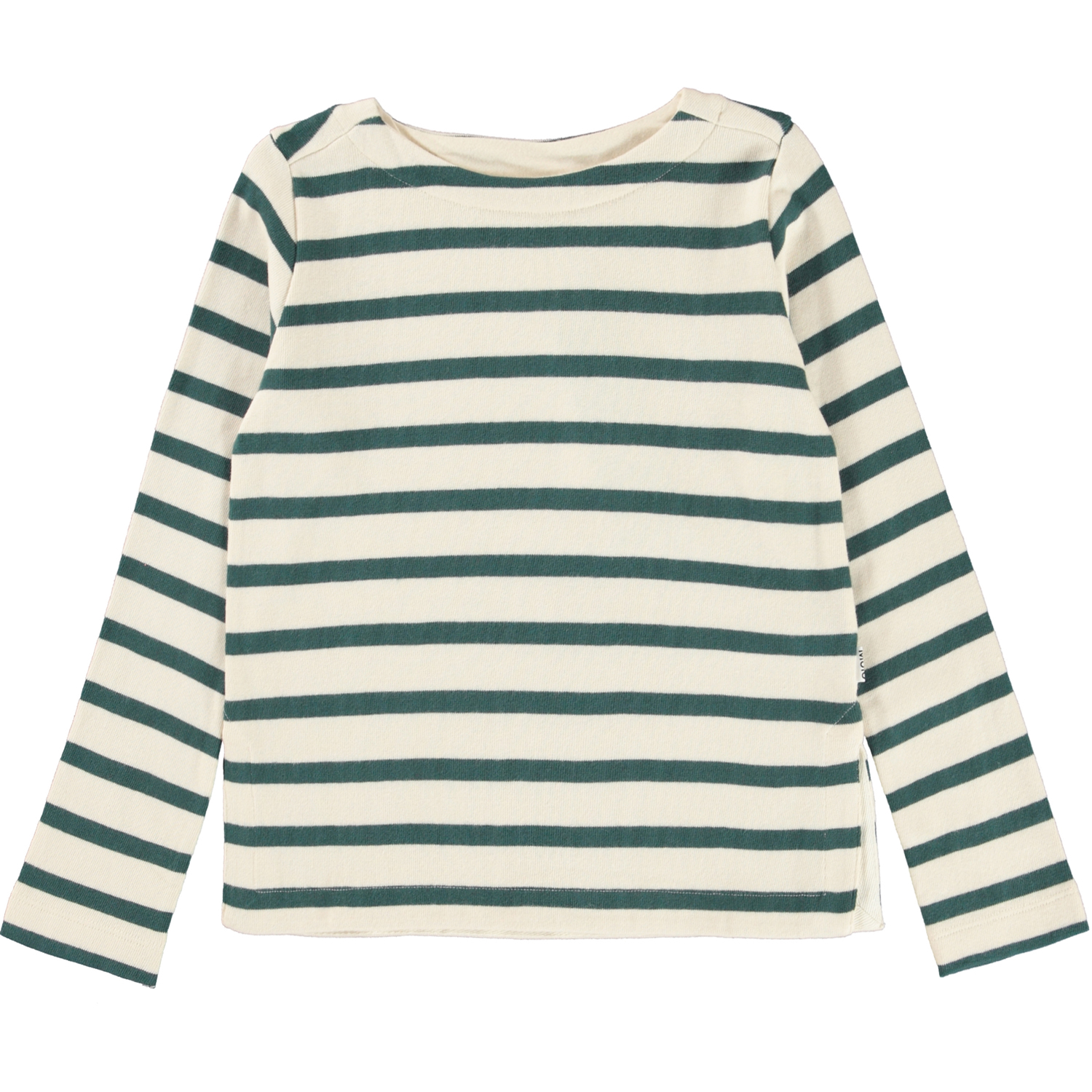 Rafina is een lichtgekleurde longsleeve met groene streepjes.