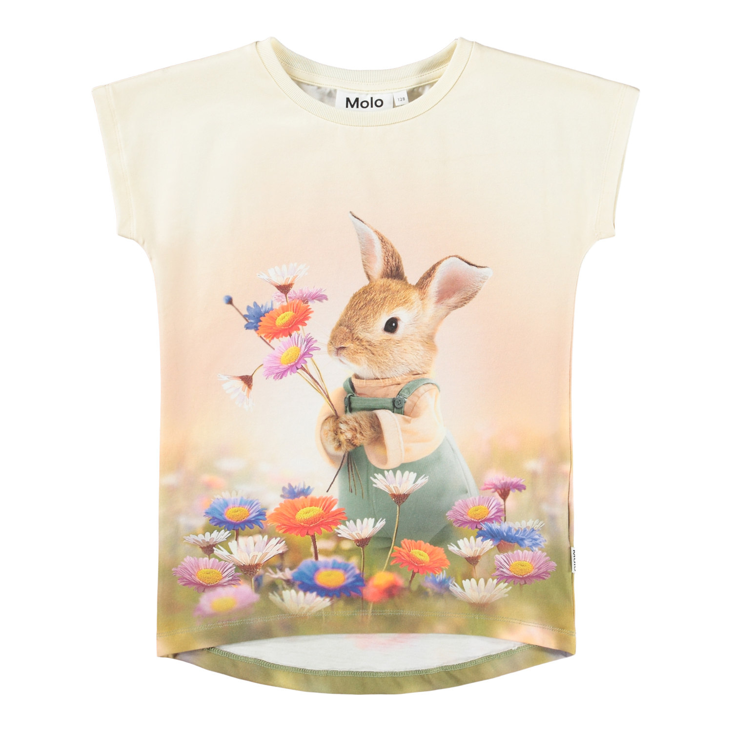 Lichtoranje t-shirt van biologisch katoen met op de voorkant een print van een konijn in een kleurrijk bloemenveld. Het t-shirt heeft een normale pasvorm en een ribboord rond de hals. Het is achter langer dan aan de voorkant.