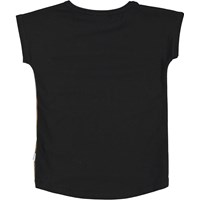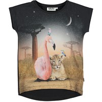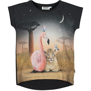 Ragnhilde is een zwart t-shirt van biologisch katoen dat aan de achterkant iets langer is. Op de voorkant staat de print Flamingo and Cub, waar een flamingo en een  luipaardwelp samen genieten van de prachtige nachtelijke Savanne hemel.