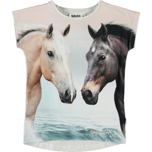 Ragnhilde is een t-shirt met op de voorkant een print van twee prachtige paarden met op de achtergrond de oceaan. Het t-shirt is aan de achterkant langer.