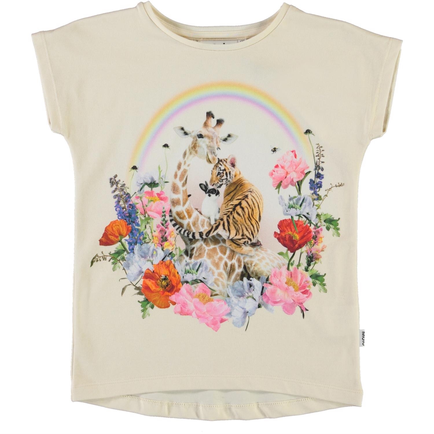 Ragnhilde is een lichtroze t-shirt met een print van een giraf, tijger en konijn met een bloemenkrans en een regenboog erboven. Het t-shirt is aan de achterkant langer.