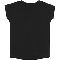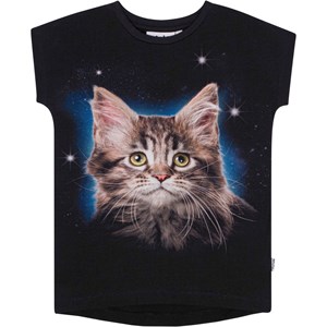 Zwarte biologische katoenen t-shirt met zeer korte mouwen. Het t-shirt heeft een mooie pasvorm en is langer aan de achterkant. Op de voorkant staat een print van een poes onder de nachtelijke hemel.