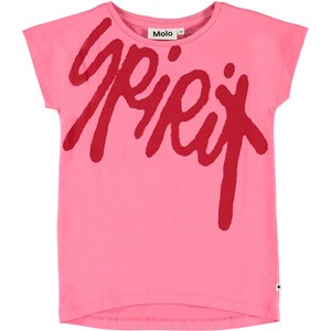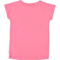 Ragnhilde is een roze t-shirt met zeer korte mouwen en een rode tekstprint op de voorkant.