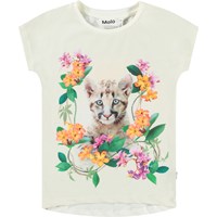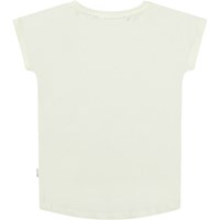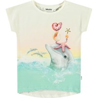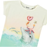 Elastische gebroken wit t-shirt van biologisch katoen. Het t-shirt heeft een normale pasvorm, kleine korte mouwen, ribboord rond de hals en is aan de achterkant langer dan aan de voorkant. Het heeft op de voorkant een print van de zee en een dolfijn die jongleert met kleurrijk koraal.