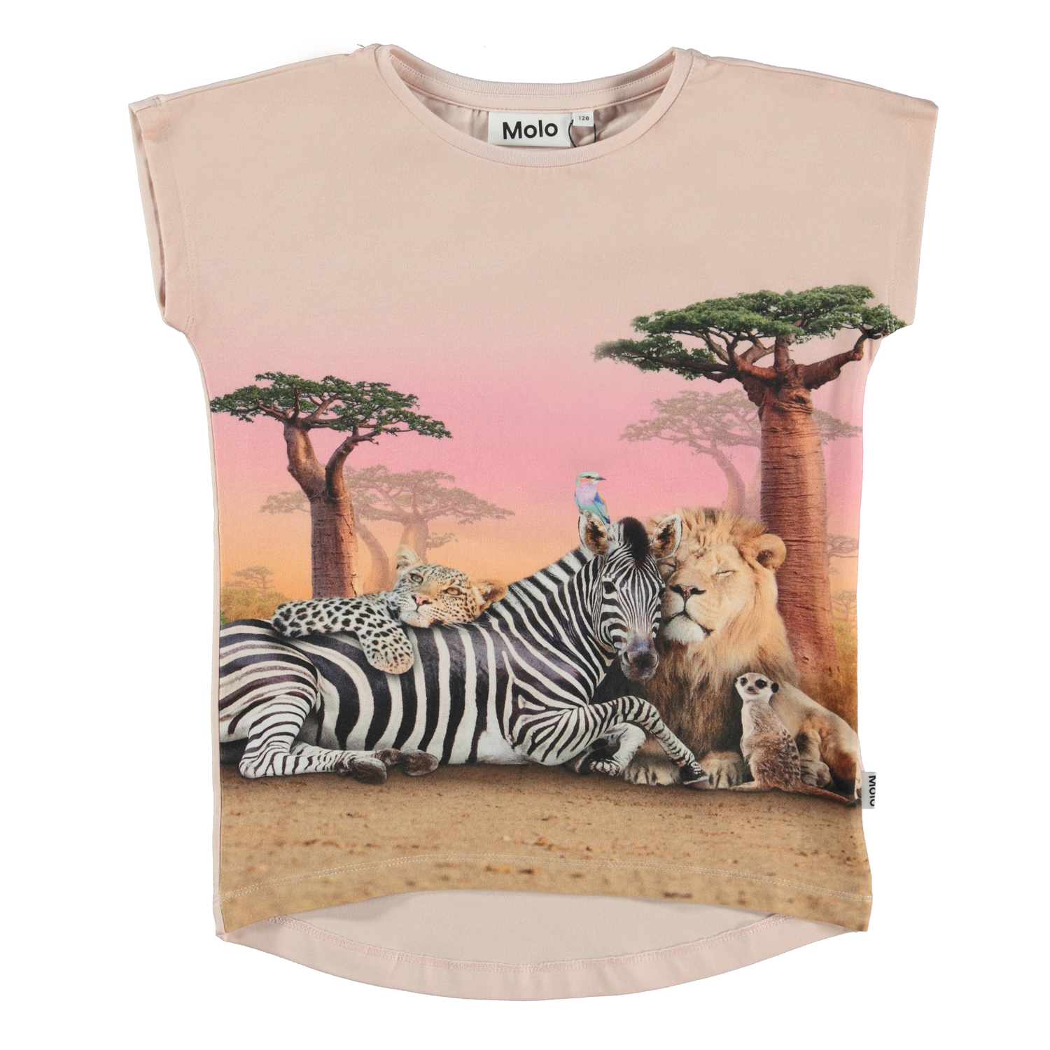 Ragnhilde is een roze t-shirt van biologisch katoen dat aan de achterkant iets langer is. Op de voorkant staat de Wild Wonderful print waarop alle dieren van de Savanne bij elkaar liggen.