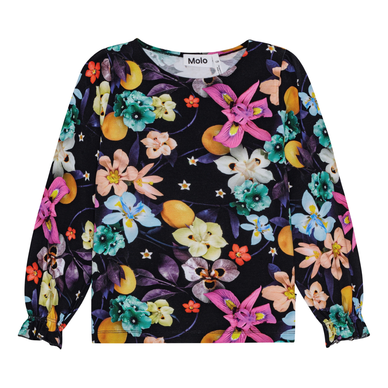 Shirt met lange mouwen van biologisch katoen met een print van kleurrijke bloemen. Het shirt heeft een ronde hals, mouwen met plooien en elastiek rond de polsen, wat zorgt voor een kleine ruche.
