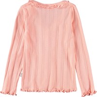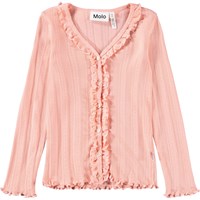 Perzikkleurig vest van zachte, fijngebreide katoenen jersey met een subtiel ajourpatroon. Het model heeft lange mouwen, een V-hals en kleine knoopjes aan de voorkant. Ruches langs de halslijn, knoopsluiting en zoom zorgen voor een romantische en speelse uitstraling.