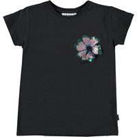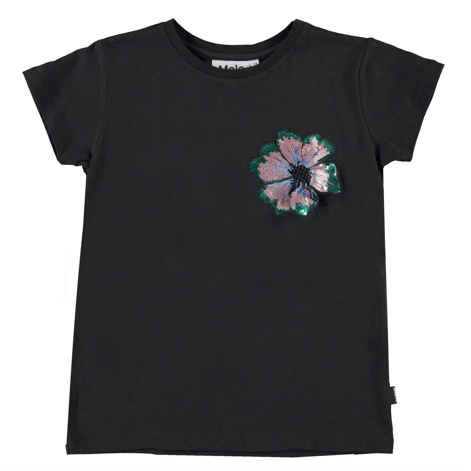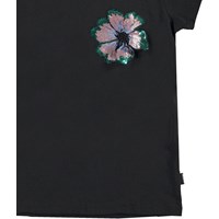 Ranva is een zwart t-shirt met een applicatie van een lovertjebloem