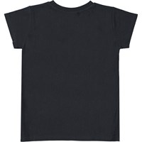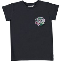 Zwart t-shirt met op de voorkant een kunstwerk. Het kunstwerk is een geborduurde bloem van een kleine lovertjes in de kleuren paars en groen. Dit t-shirt is van 100% katoen, heeft korte mouwen, een ronde hals met ribboord en is slim fit.