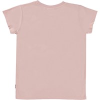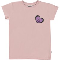 Roze t-shirt met op de voorkant een kunstwerk. Het kunstwerk is een paars en groen hartje van een kleine lovertjes. Dit t-shirt is van 100% katoen, heeft korte mouwen, een ronde hals met ribboord en is slim fit.