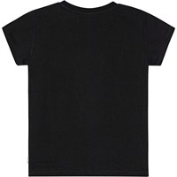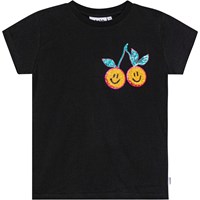 Zwarte t-shirt met korte mouwen van biologisch katoen met een ronde hals. Het t-shirt heeft een normale pasvorm en een sequin borduursel van gele kersen met lachende gezichten.