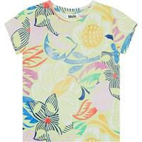 Lichtgroene biologische katoenen t-shirt met zeer korte mouwen. Het t-shirt heeft een mooie pasvorm en heeft een kleurrijke print van abstracte bloemen.