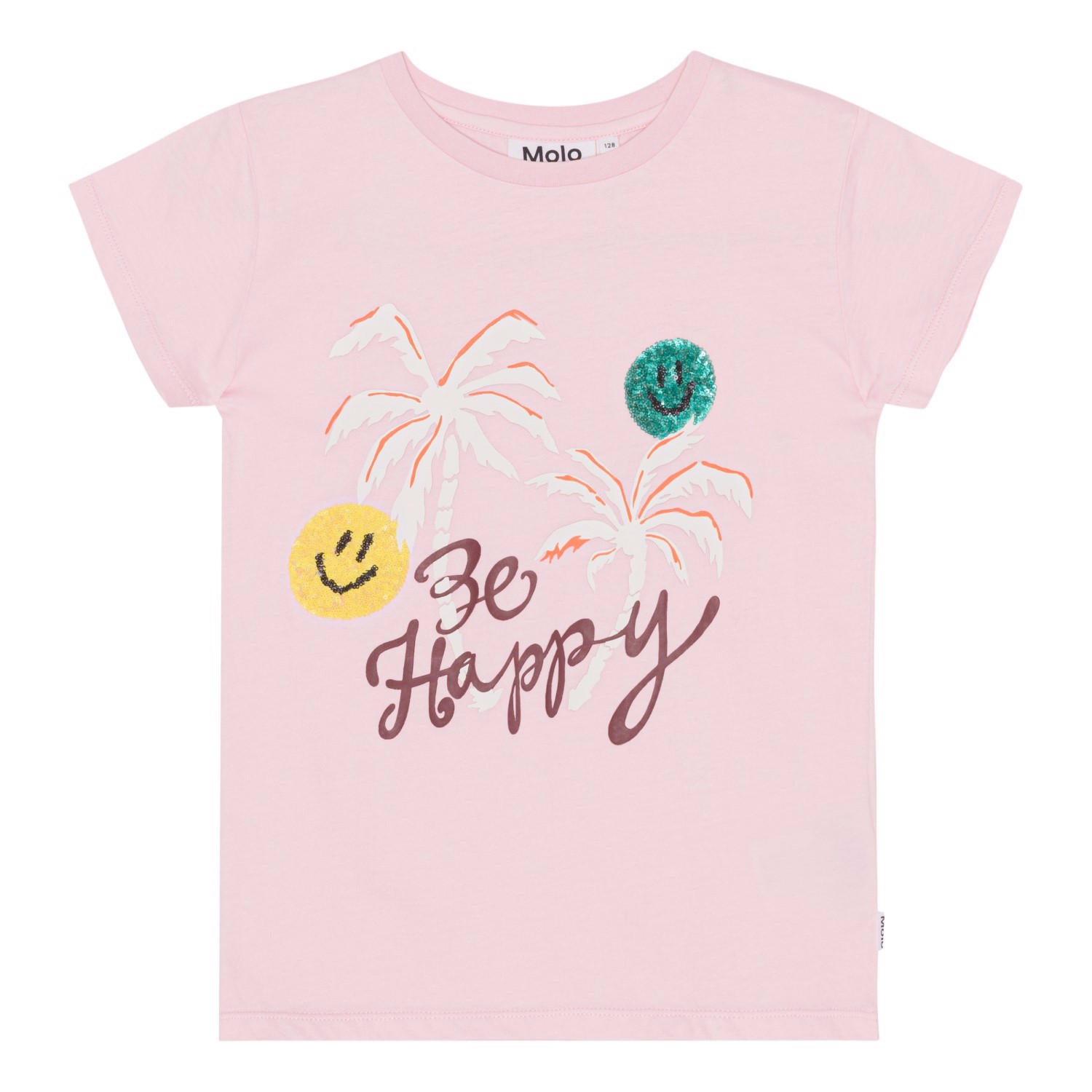Roze t-shirt van biologisch katoen met twee geborduurde smiley's van pailletten en palmbomenprint met de tekst 'Be Happy'. Het t-shirt heeft een ronde hals en een normale pasvorm.