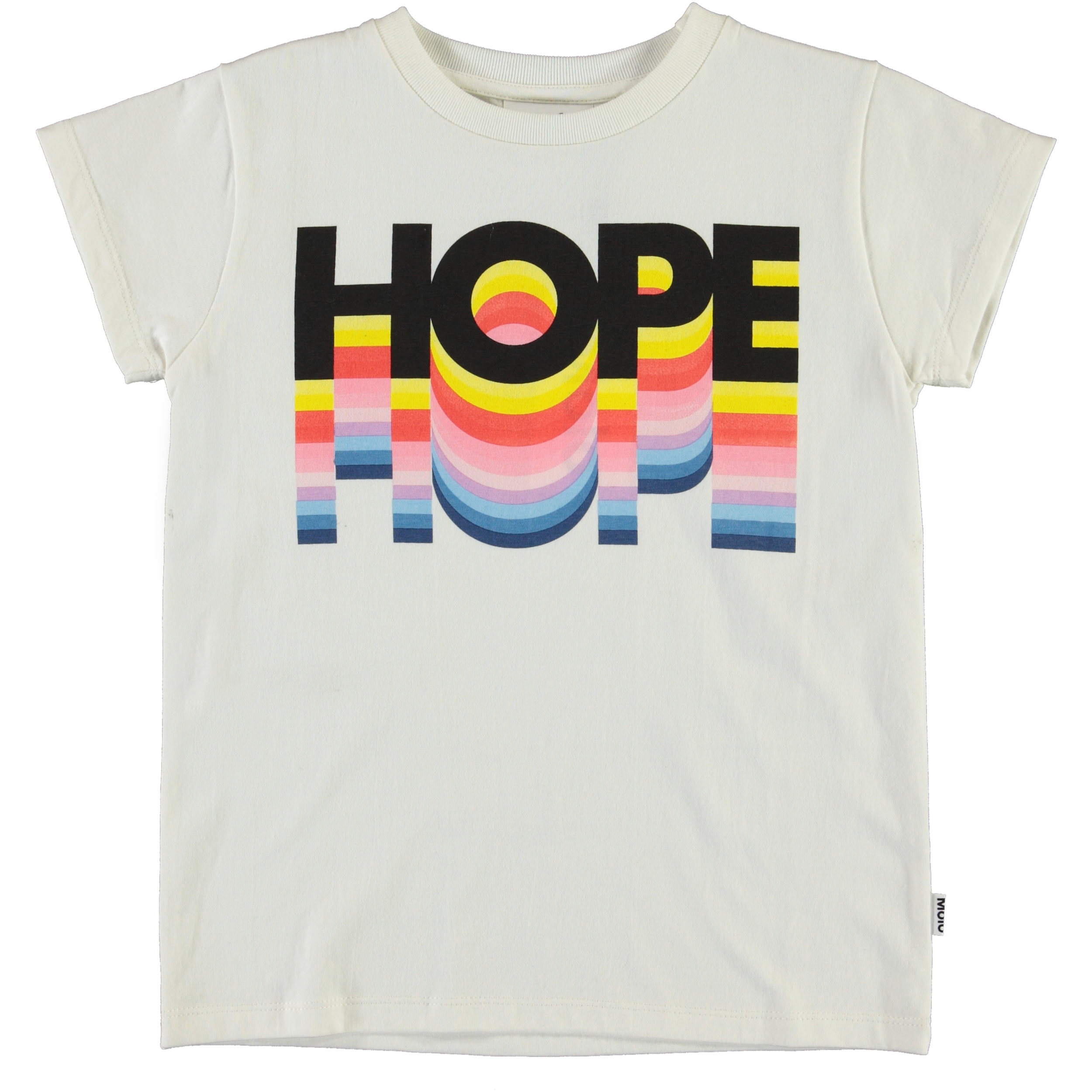 Ranva is een wit t-shirt met de tekst ‘Hope’ op de voorkant, geschreven als een regenboog.