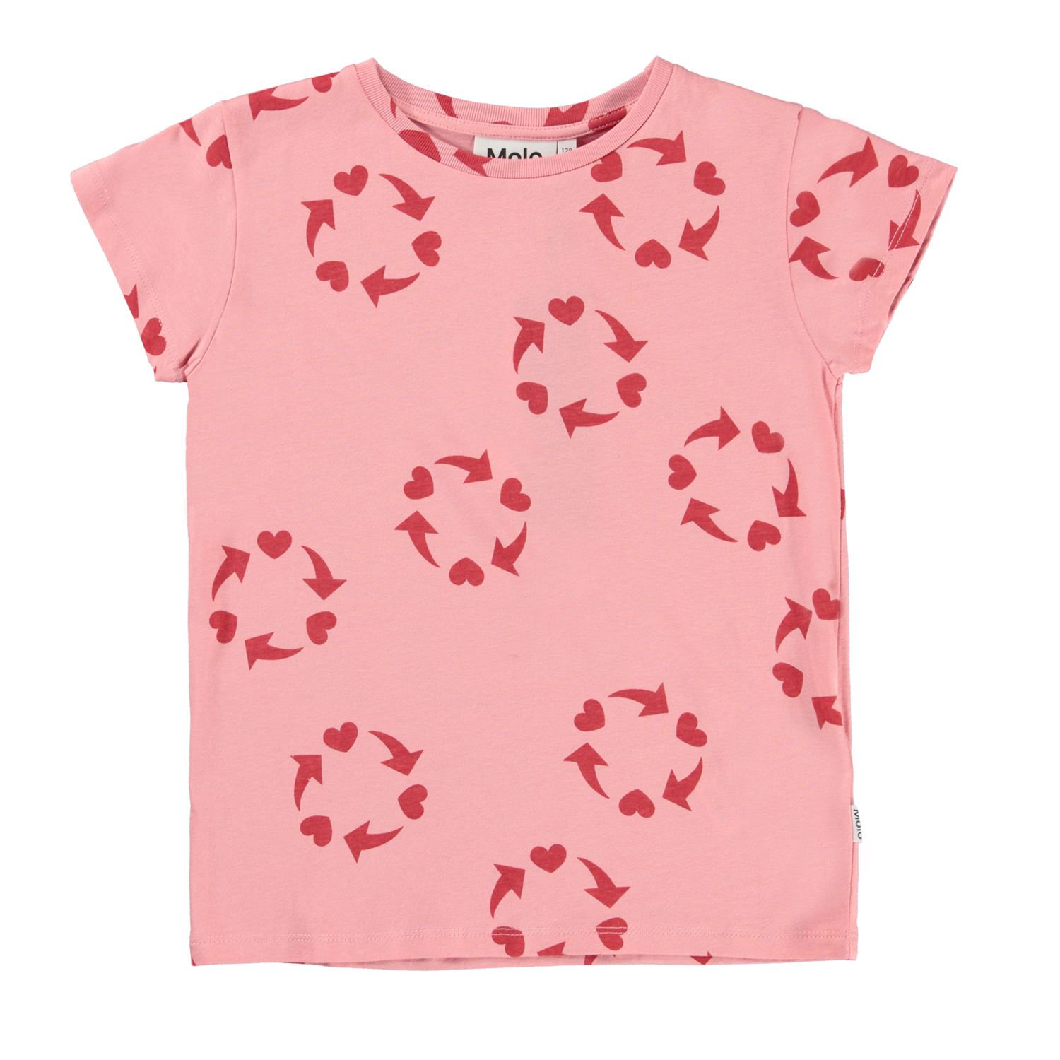 Ranva is een roze t-shirt met een print van gerecyclede hartjes die in cirkels gaan.