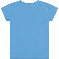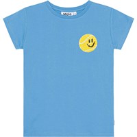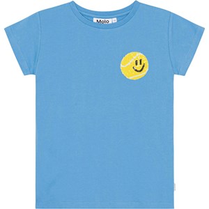 Blauwe t-shirt van biologisch katoen met op de borst een geborduurde smiley tennisbal van pailletten Het t-shirt heeft een ronde hals en een normale pasvorm.