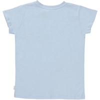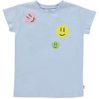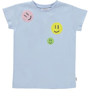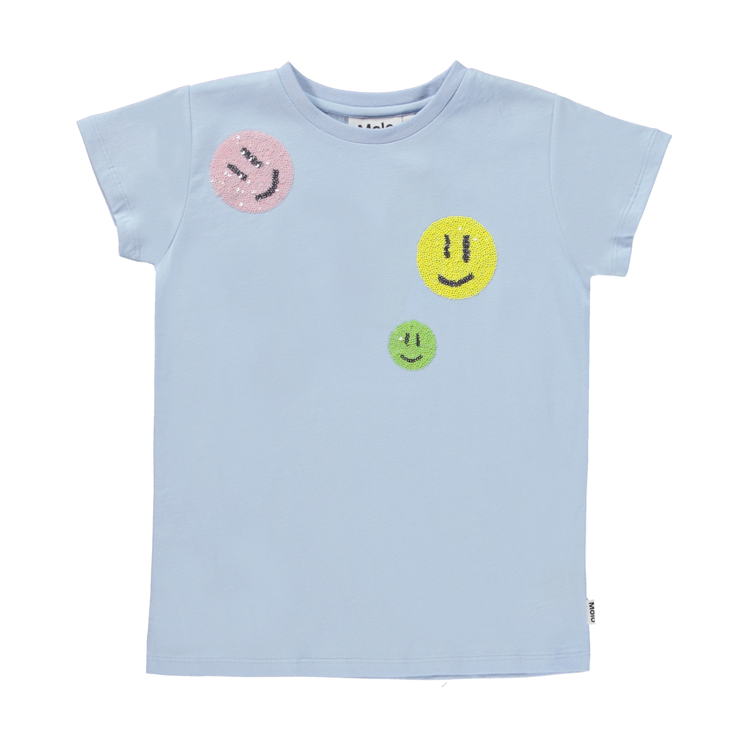 Ranva is een lichtblauwe t-shirt van biologisch katoen. Ranva heeft een slim fit met op de voorkant geborduurde lachende gezichtje met lovertjes.