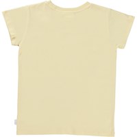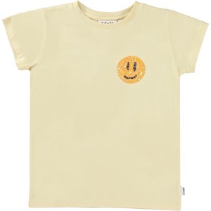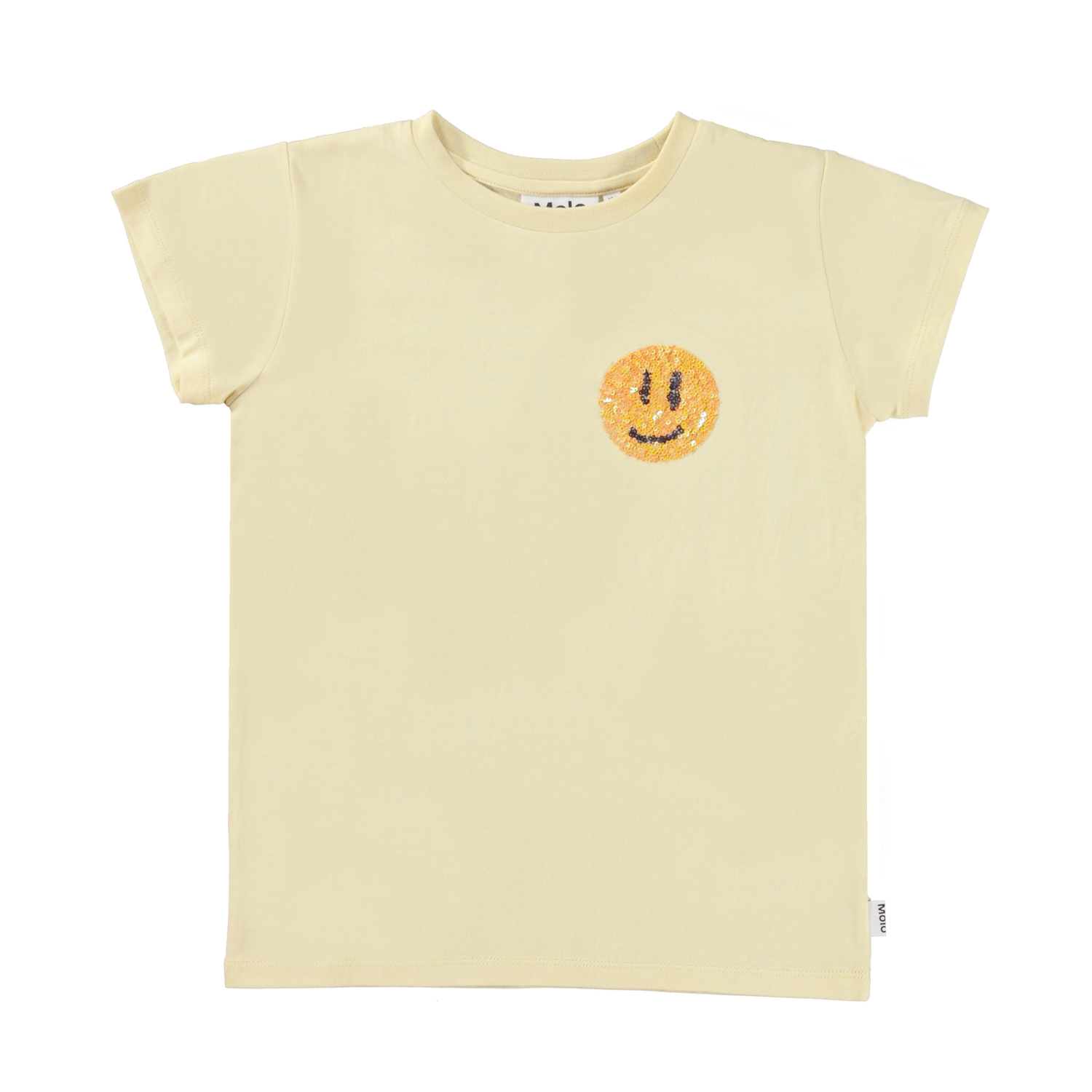 Ranva is een lichtgele t-shirt van biologisch katoen. Ranva heeft een slim fit en een oranje geborduurde smiley met lovertjes op de borst.