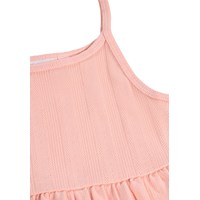Koraalkleurige topje met smalle bandjes gemaakt van biologisch katoen. Het topje heeft een opengewerkt patroon en is afgewerkt met een brede, geplooide ruche-rand, wat zorgt voor een lichte en speelse uitstraling.