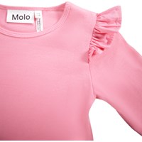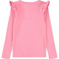 Roze aansluitende longsleeve gemaakt van zacht biologisch katoenen ribstof met een ronde hals en ruches op de schouder.