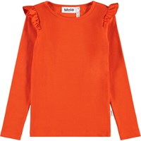 Rode aansluitende longsleeve gemaakt van zachte biologische katoenen ribstof met een ronde hals en ruches op de schouder.