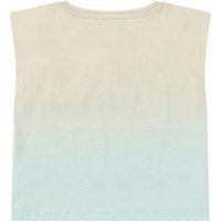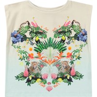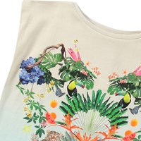 Beige en lichtblauwe oversized top van biologisch katoen met ribboord rond de hals en grote armsgaten. Het topje heeft een kleurrijke print van het leven in de junglel in de vorm van een hart.