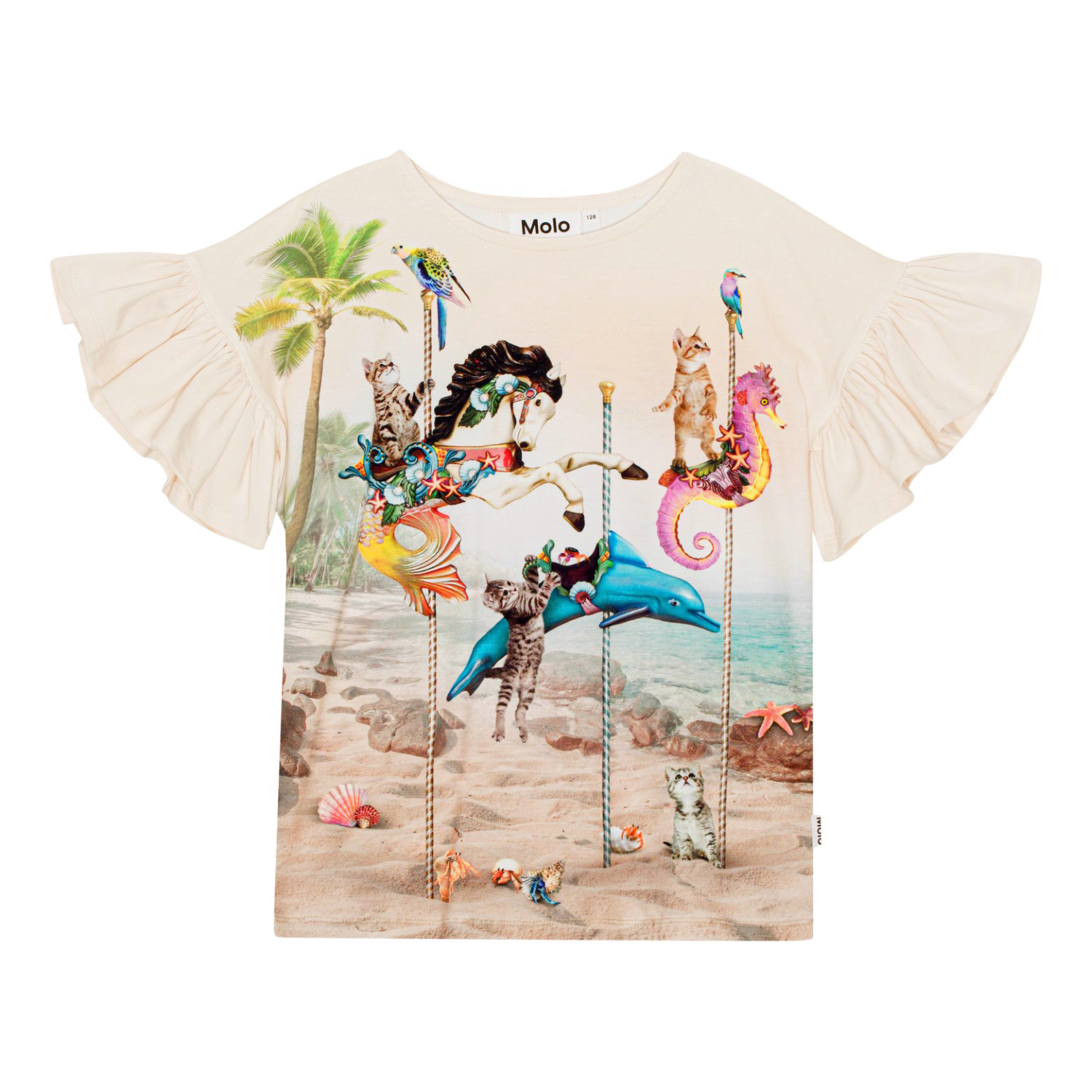 Witte biologische katoenen t-shirt met mouwen met ruches. Op de voorkant staat een fantasierijke print van een tropisch eiland, dieren van de draaimolen en spelende poesjes.