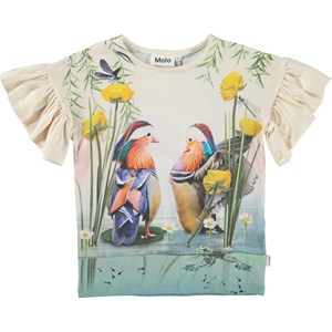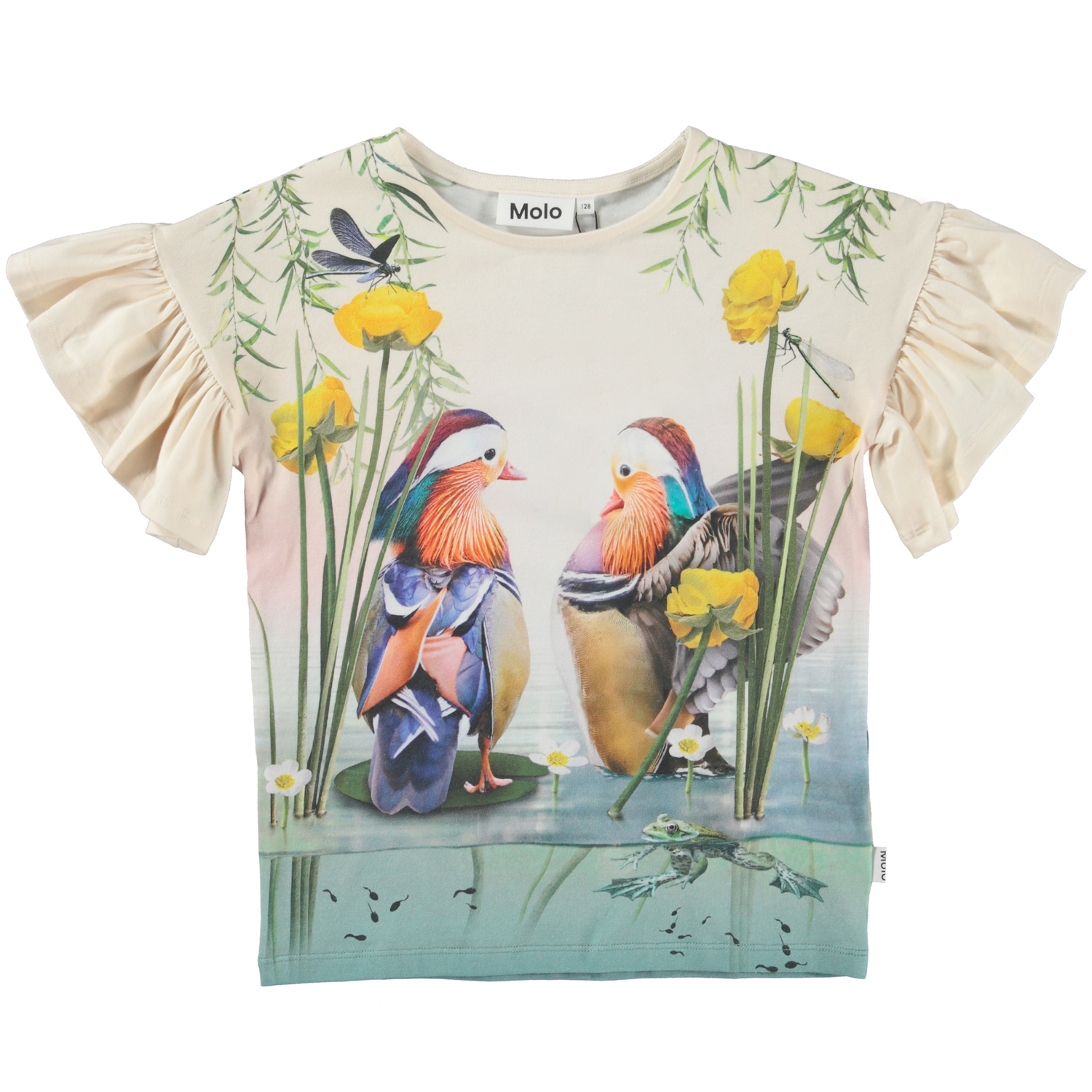 Rayah is een t-shirt van biologisch katoen. Rayah heeft verlaagde schouders met ruches aan de onderkant van de mouwen die een speelse beweging creëren. Het t-shirt heeft de Morning Dew Pond print, waar je vogels ziet zitten op het oppervlak van een vijver. Je ziet kleine kikkervisjes onder het wateroppervlak.