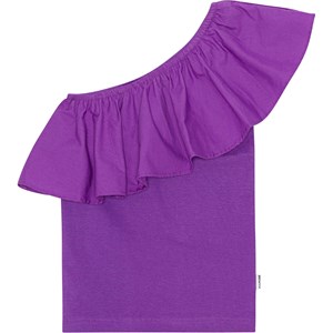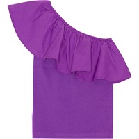 Paarse one-shoulder top van biologisch katoen met stretch. De top heeft een aansluitende pasvorm en een brede poplin-ruche rond de hals.
