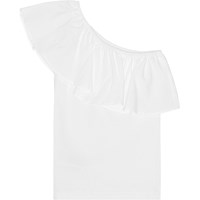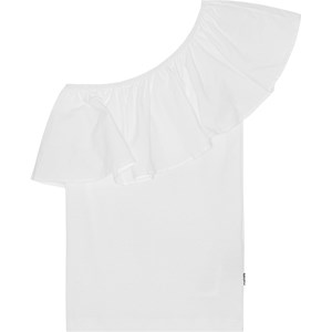 Witte one-shoulder top van biologisch katoen met stretch. De top heeft een aansluitende pasvorm en een brede poplin-ruche rond de hals.