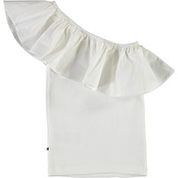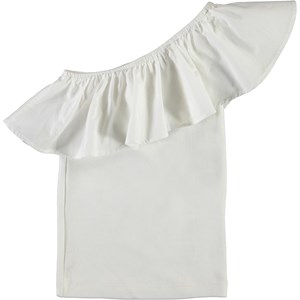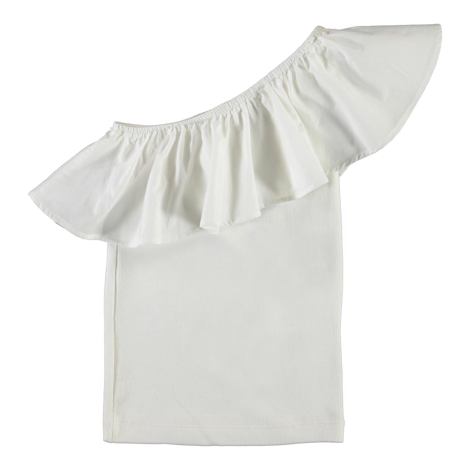 Rebecca is een witte asymmetrische top met een schuine ruche.