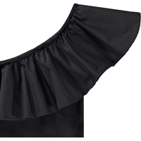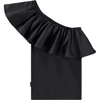 Zwarte one shoulder top van elastisch biologisch katoen. De top heeft een nauwsluitende pasvorm en een brede poplin ruche langs de hals.