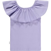 Paarse off-shoulder topje zonder mouwen gemaakt van zacht, biologisch katoenen jersey met stretch. Het topje heeft een brede poplin ruche langs de elastische hals, waardoor de kraag off-shoulder gedragen kan worden.
