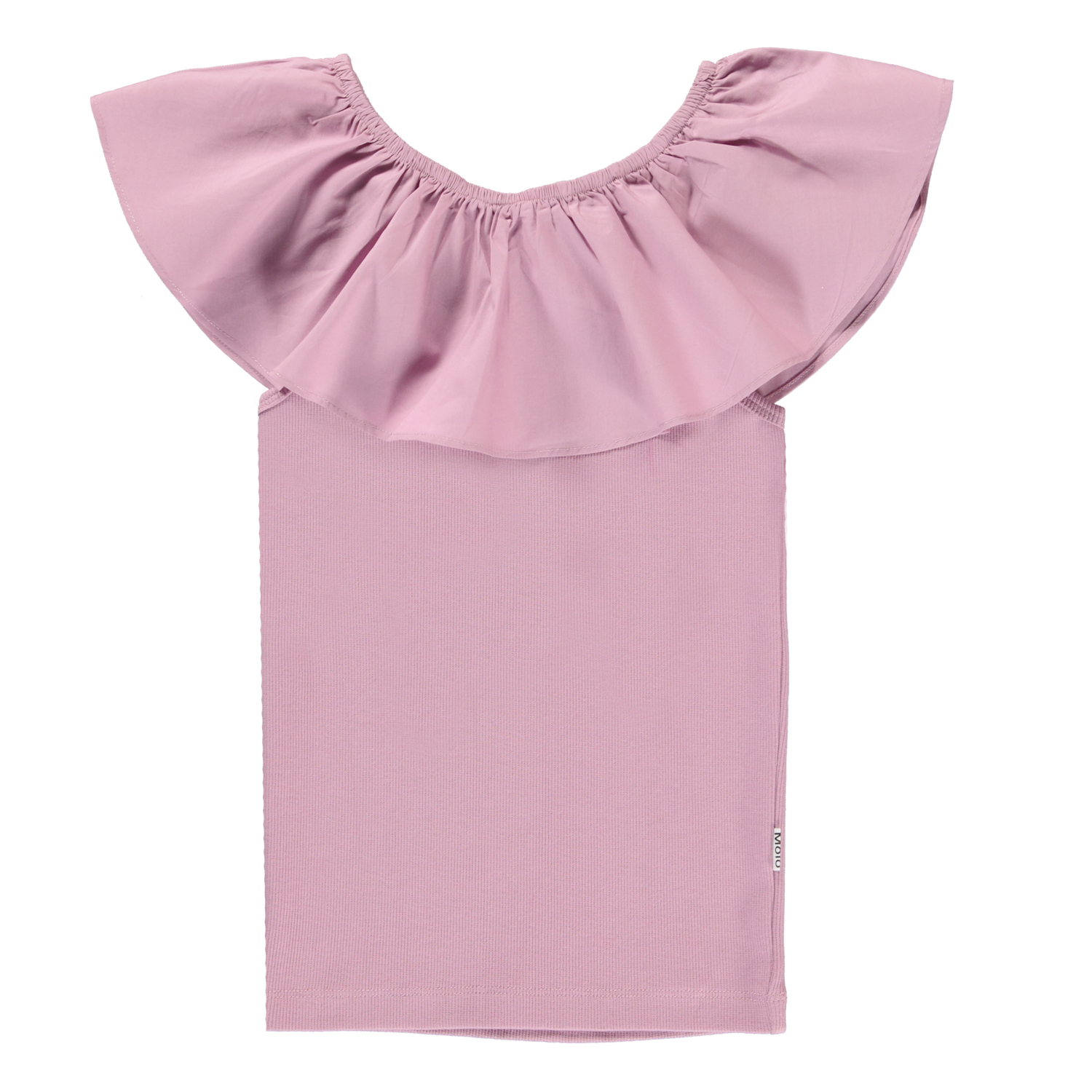 Reca is een paars hemdje in rib met een grote ruches aan de bovenkant, die op of van de schouders kan worden gedragen.
